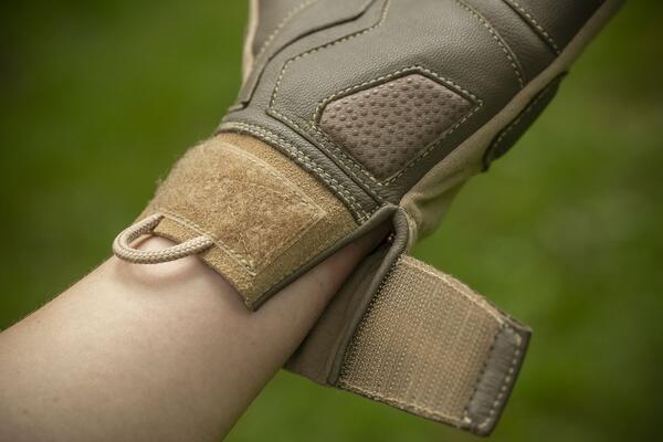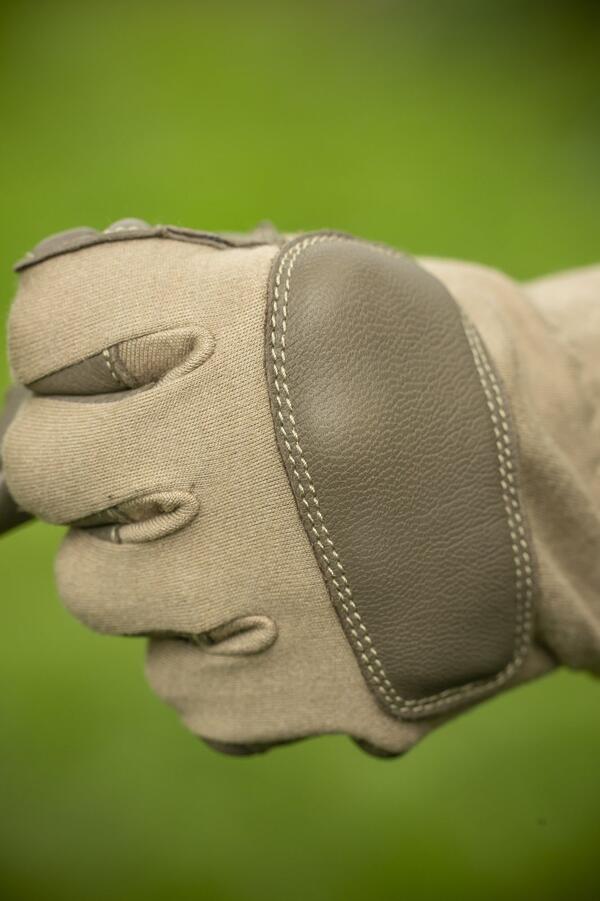 - Special index finger design with a stretched seam on the back side for more sensitive control of the weapon and longer glove life.
